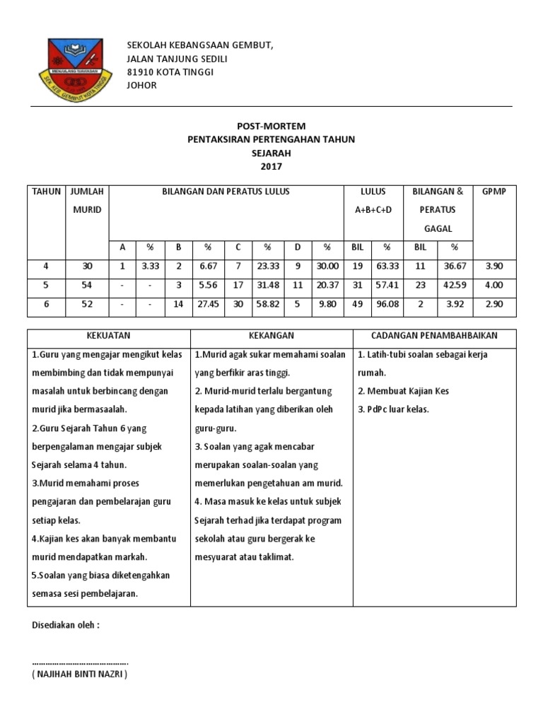 Visual and print sources. Up to 24 cash back 50 POST-MORTEM DAN STRATEGI PENAMBAHBAIKAN PRESTASI AKADEMIK 51 Post-Mortem 511 Post-mortem ialah pemeriksaan sesuatu rancangan yang gagal untuk mengetahui sebab kegagalan Kamus Dewan edisi Ke-4 512 Dalam konteks pendidikan post-mortem diadakan untuk menganalisis. Analisa keseluruhan bagi mata pelajaran SEJARAH Tahun Gred A Gred AGred B Gred B Gred C Gred C Gred D Gred E Bilangan gagal Bilangan lulus Jumlah calon Bilangan calon tidak hadir Peratus kelulusan GPMP 2013 Bil 8 13 23 22 30 16 38 20 23 170 196 3 88.
